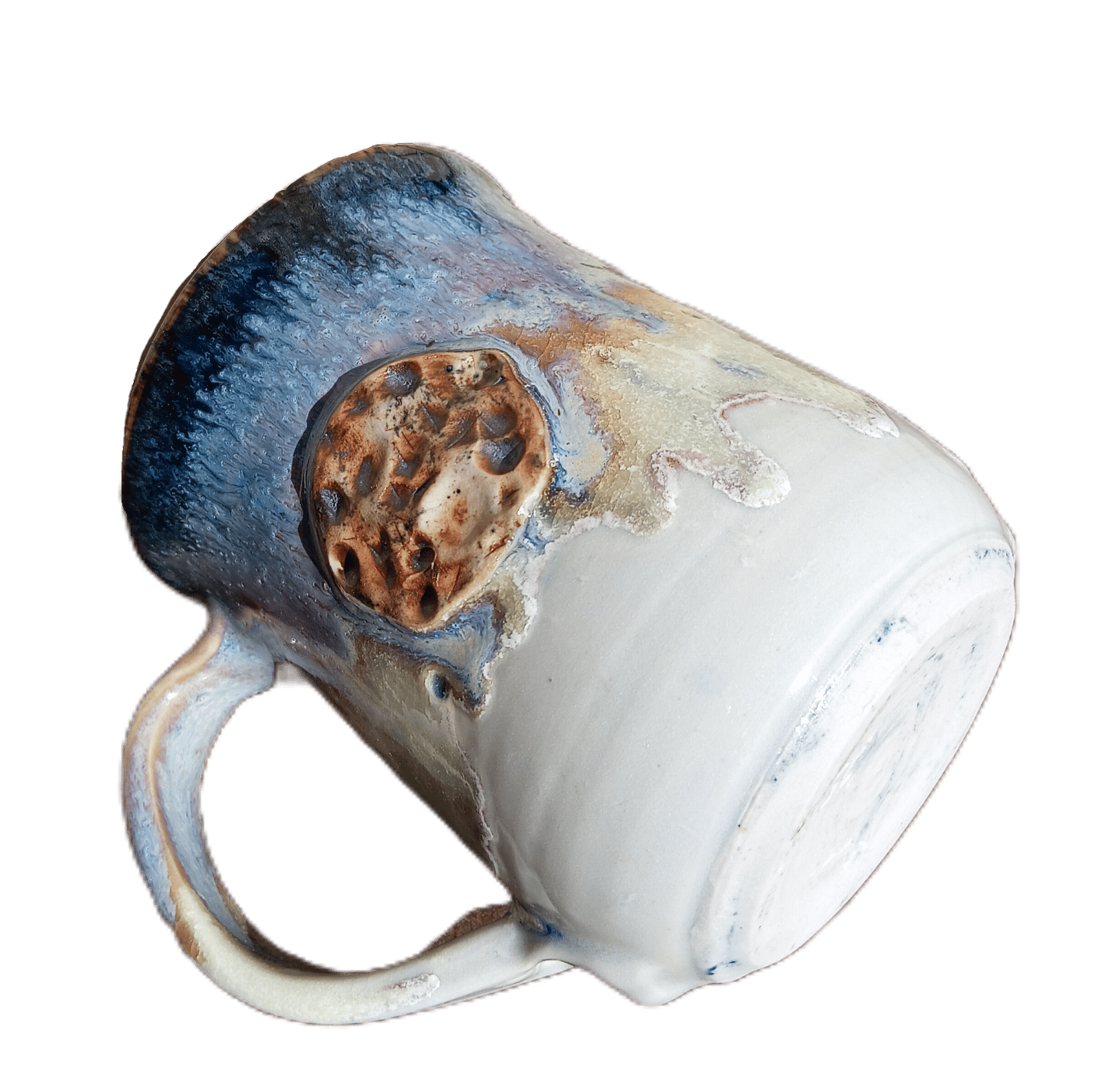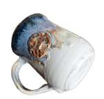 Coffee mug with Tenmoku interior, chun, lemon and white exterior and raised moon feature. Outward lip feels great on the lip. Sturdy handle for 2 or 3 fingers.