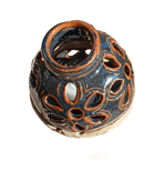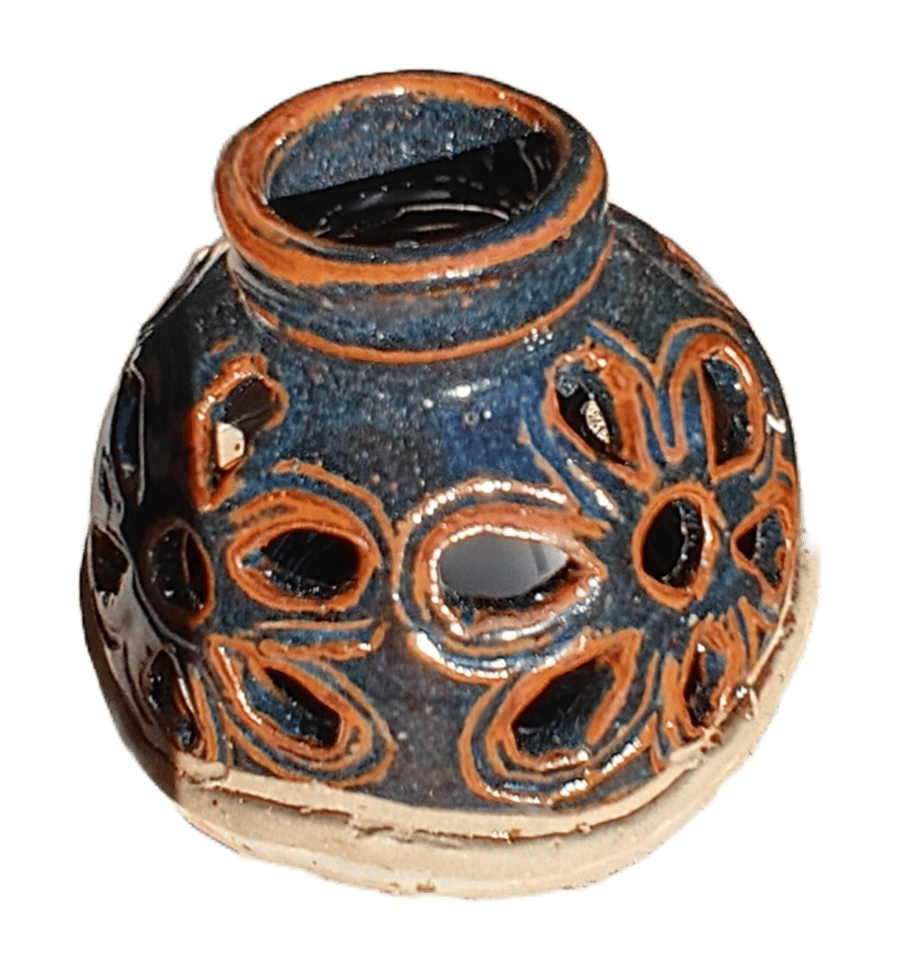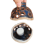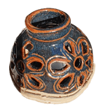 Stoneware tealight candle holder. Cuts and piercings make pretty patterns on wall and/or ceiling. 10cm high. Top half lifts off to access candle. One tealight candle included.