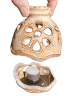 Stoneware tealight candle holder. Cuts and piercings make pretty patterns on wall and/or ceiling. 14cm high. Top half lifts off to access candle. One tealight candle included.