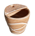 Stoneware travel mug. Drink directly from the hole, or use a straw. Chun glaze applied thinly. Decoration created using narrow tape to reject the glaze. Tape is removed before firing. Approx 10cm tall.