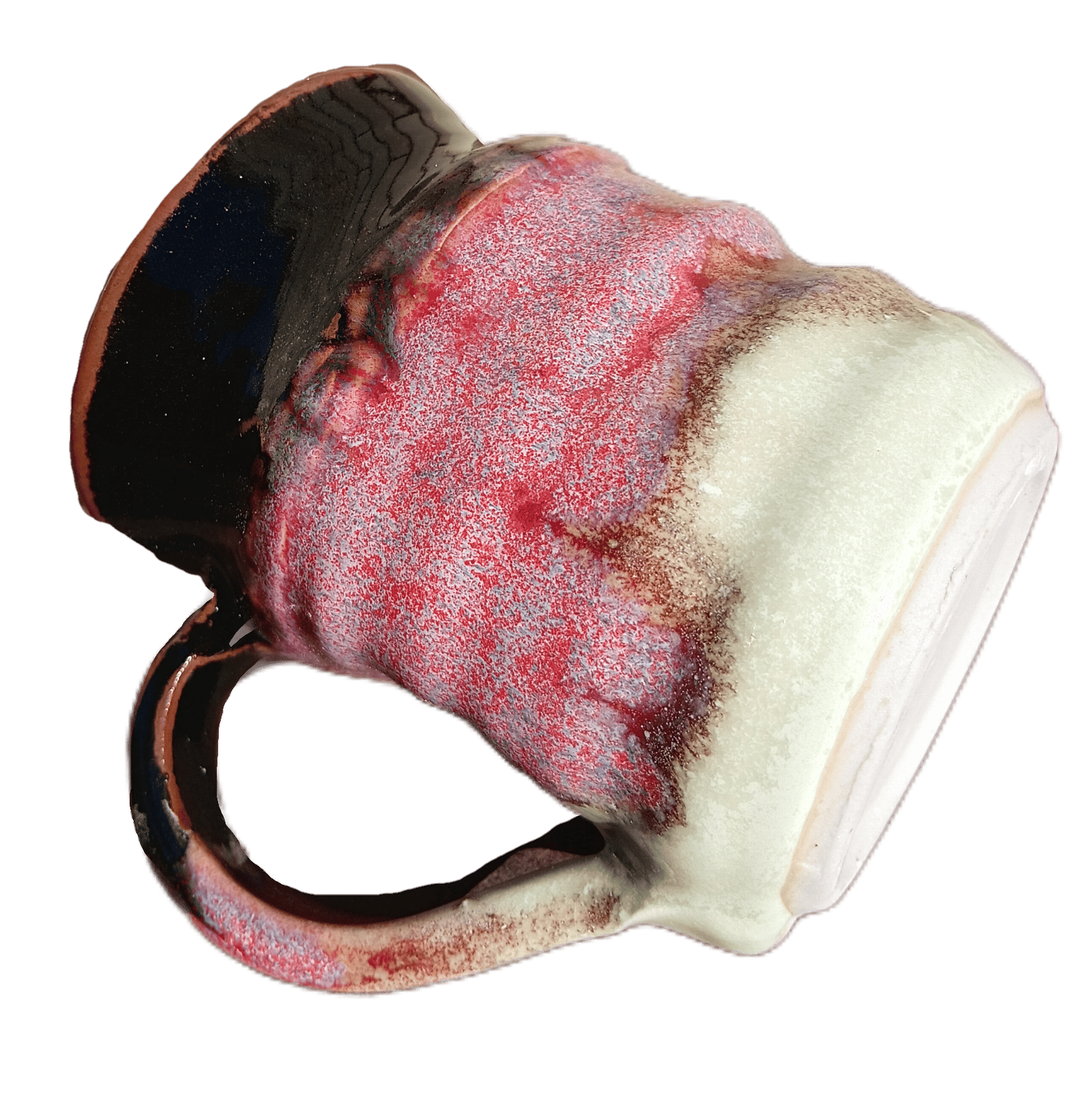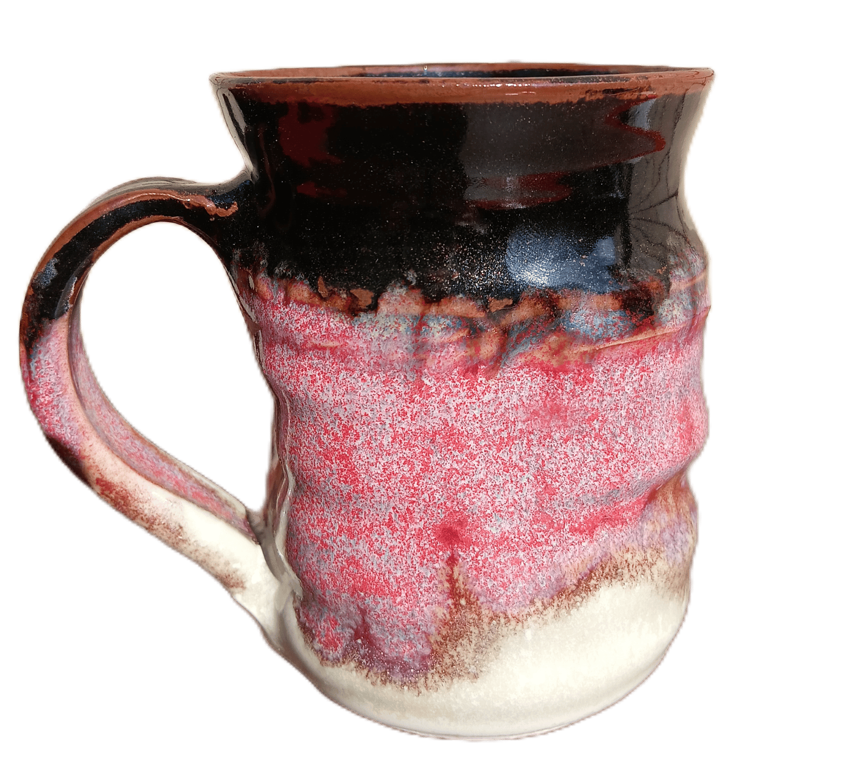 Tenmoku, watermelon and lemon coffee mug. Intentionally warped for uniqueness. Perhaps would suit a warped friend. Outward lip feels great on the lip. Sturdy handle for 2 or 3 fingers.